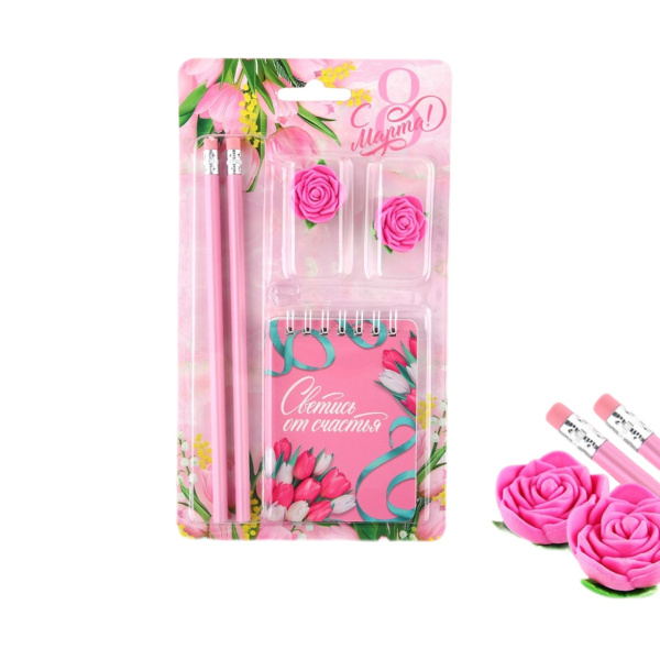 Подарочный набор 'С 8 марта', карандаши (2 шт;уп), ластики (2 шт;уп), блокнот, 9891577