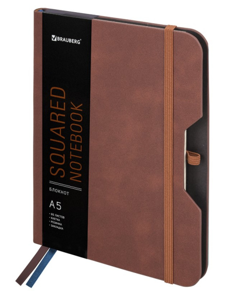 —Блокнот А5, BRAUBERG 'NOTE', под кожу софт-тач, с резинкой, 80 л., клетка, коричневый, 113436