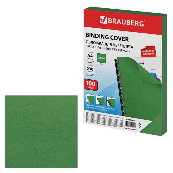—Обложки картонные д/переплета А4 Brauberg 100 шт., тисн. под кожу, 230 г/м2, зеленые, 530949
