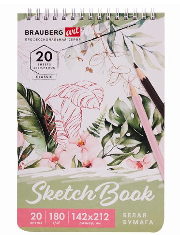 Скетчбук, белая бумага 180 г;м2, 142х212 мм, 20 л, гребень, твердая обложка, BRAUBERG, 112992