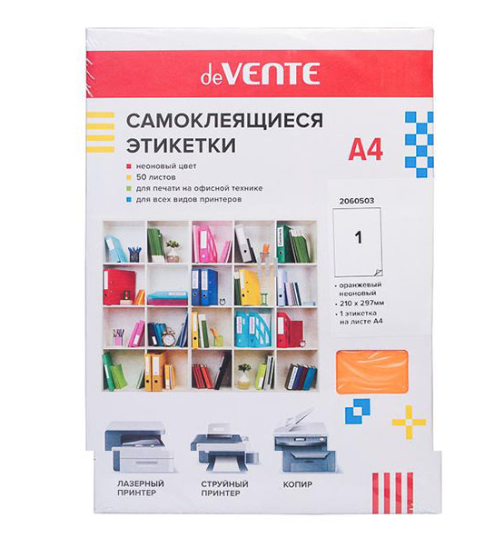 Этикетки самоклеящиеся 'deVENTE', Neon, А4 , оранжевые , 210х297мм , 50л, 2060503
