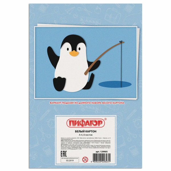—Белый картон А4 8 л Пифагор Пингвин-рыболов немелованный 200х290 мм 129905
