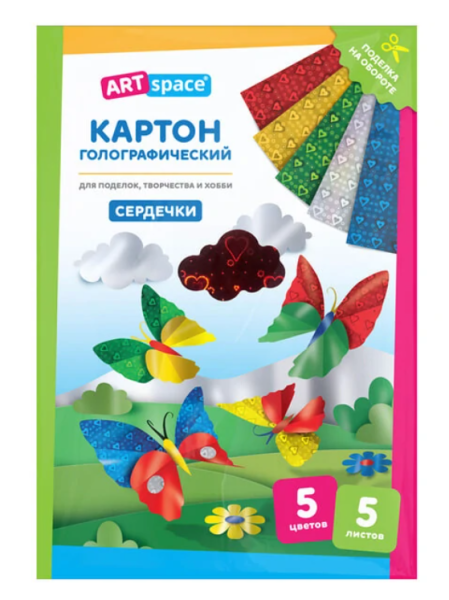 —Картон цветной А4, ArtSpace, 5л., 5цв., металлиз. голограф. узор 'Сердечки', в папке КМА4_37980