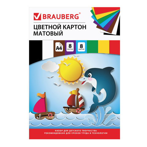 —Цветной картон А4 Brauberg Дельфин 8л 8цв немелованный односторонний 129909