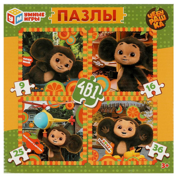 Чебурашка. Пазлы в коробке, набор 4 в 1- 9, 16, 25, 36 деталей. (175х175х50мм), 367445