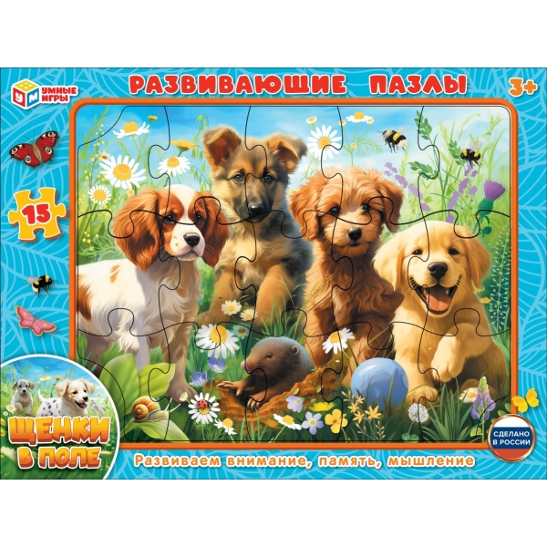 —Щенки в поле. Фигурный пазл в рамке. 15 деталей. 285х215х5 мм, 368505