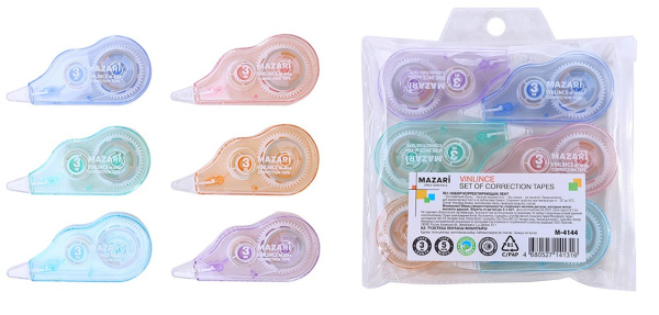 Корректирующая лента-роллер VINLINCE, 5 мм x 3 м, ассорти 6 цв, ПВХ-чехол на zip-молнии, M-4144-1