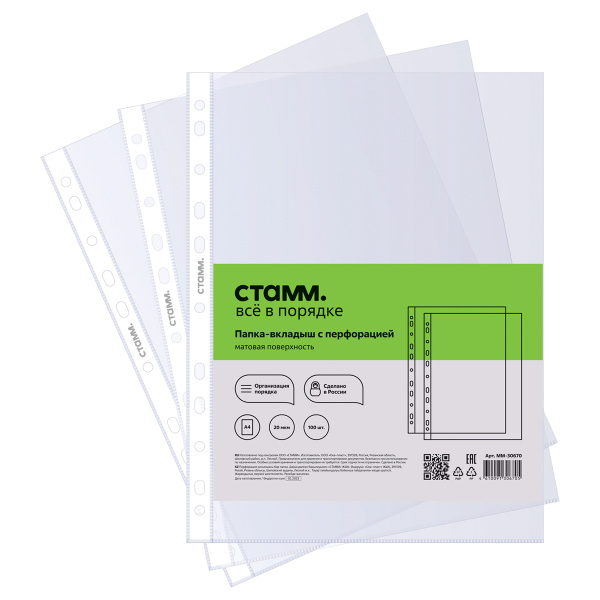 —Папка-вкладыш с перфорацией (файл) СТАММ А4, 20 мкм, матовая, ММ-30670