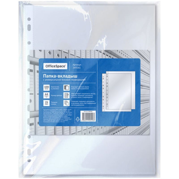 —Папка-вкладыш с перфорацией (файл) OfficeSpace А4, 25 мкм, глянцевая, (100 шт;уп), 269261
