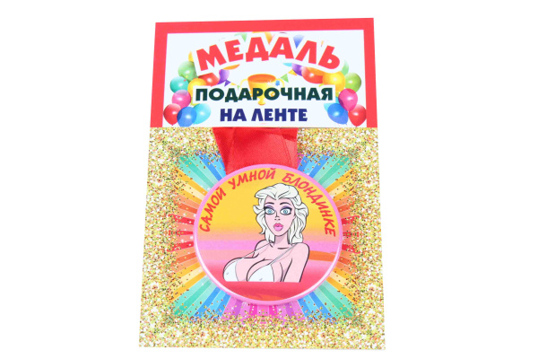 —Медаль пластиковая на ленте Самой умной блондинке D=5,5 см.