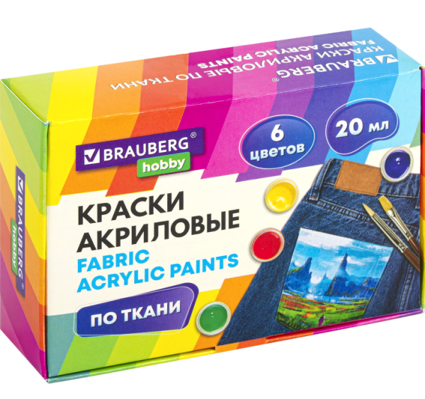 —Краски акриловые по ткани 6 цветов по 20 мл BRAUBERG HOBBY, 192441