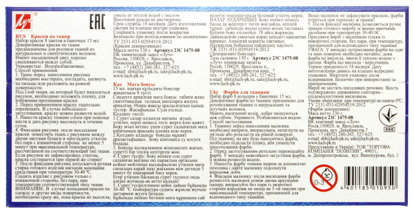 —Акриловые краски по ткани 8 цв. Луч, по 15 мл., картон. уп., 23С 1475-08