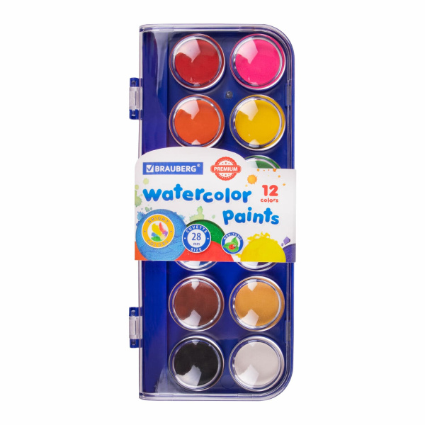 Краски акварельные 12 цв. BRAUBERG 'PREMIUM' , круглые кюветы 28 мм , пенал, 191743