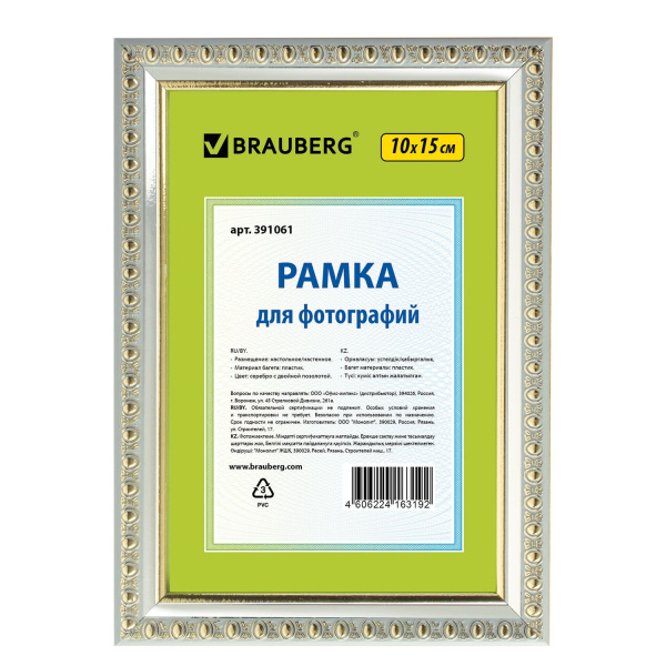 —Фоторамка 10x15 см. Brauberg "Hit5", пластик, багет 16 мм, серебро с дв. позолотой, стекло, 391061
