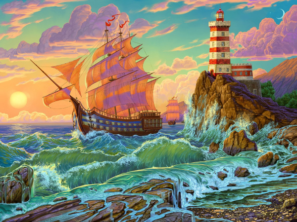 Алмазная мозаика 30х40 см. с полн. заполн. (30цв.) 'Корабль и маяк', НД-0539