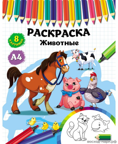 —Раскраска А4 Prof-Press 'Животные', 4 листа, 8 картинок, Р-4532