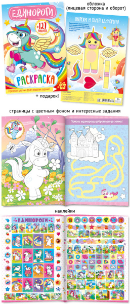—Раскраска А4 Абсолют 'Единороги', с цветным фоном + 127 наклеек, 27690