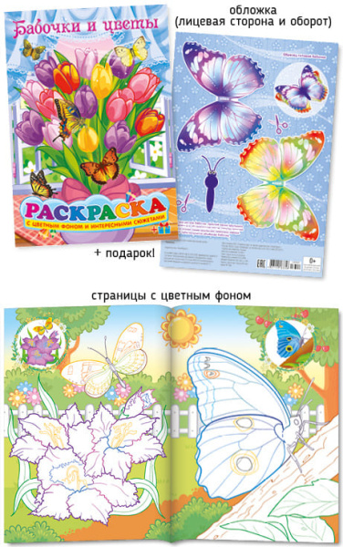 —Раскраска А4 Полипринт "Бабочки и цветы", с цветным фоном, 28362