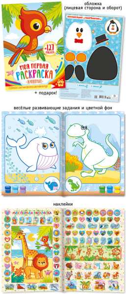 —Моя первая раскраска А4 Абсолют "Животные", с цветным фоном + 127 наклеек, 28809