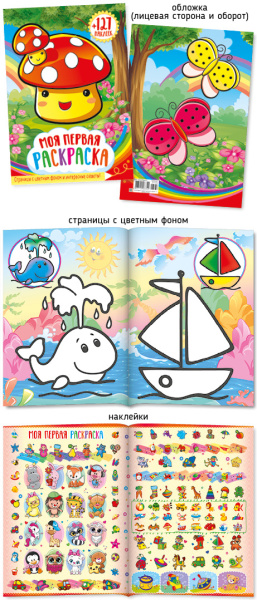 —Раскраска А4 Абсолют "Моя первая раскраска", с цветным фоном + 127 наклеек, 27138