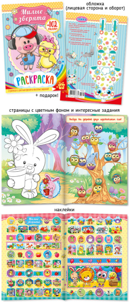 —Раскраска А5 Абсолют "Милые зверята", с цветным фоном + 102 наклейки, 27063