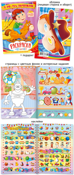 —Раскраска А5 Абсолют "Для мальчиков", с цветным фоном + 102 наклейки, 26839